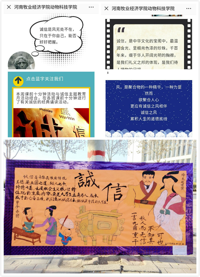进一步加强和改进老员工诚信教育,太阳成集团tyc9728展出宣传展板,内容体现了古代曾子杀猪的正面例子和烽火戏诸侯的反面例子,形象地向同学们展现了诚信对个人乃至国家的重要性。诚信是立身之本,也是立国之基,希望同学们能够积极践行诚信品德。同时,利用微信公众号、QQ空间等网络平台,推送有关诚信的格言和小故事,吸引更多的同学积极参与,希望能够让他们使诚信理念内化于心、外化于行,成为一种内在品格。
