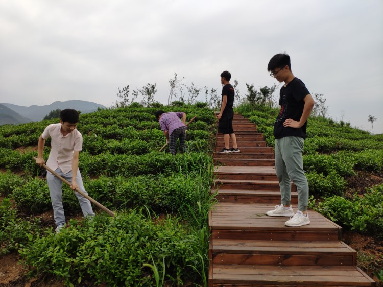 7月4日早上六点,老师早早的带我们来到一处茶山,经过一条绿茶长廊,来到茶农正在劳动的地方。经了解,他们每天在天将亮时起床,趁着太阳还没有出来带上锄头来到茶园锄草。当同学问为什么不用机器锄草,茶农解释说:一是种植茶叶的区域都是山坡,不方便机器锄草,二是有些适用锄草的机器清理一次杂草费用也不少,人工清理的话能省不少钱呢。听后,同学们蠢蠢欲动,想体验一下茶农的生活,便向茶农借锄头,下地锄草。一开始没有经验,在茶农的指导下慢慢的找到了技巧,由于时间紧迫,同学们恋恋不舍离开茶园。