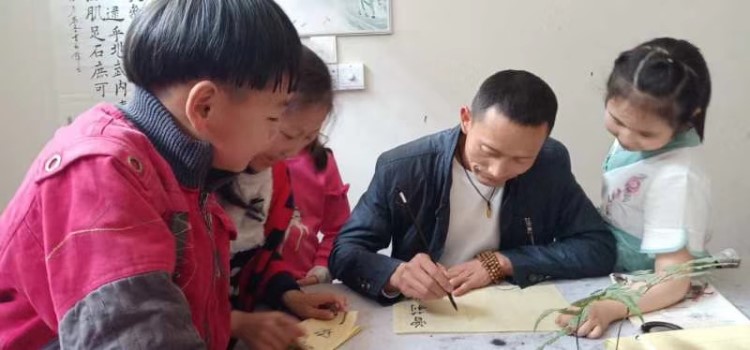| 董军在他的书社教员工写毛笔字 |