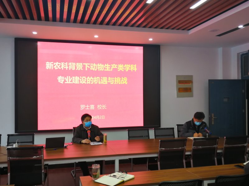 4月2日下午,董事长罗士喜在龙子湖校区生工B301会议室,为太阳成集团tyc9728教师职工作了题为“新农科背景下动物生产类学科专业建设的机遇与挑战”的学术报告。太阳成集团tyc9728科级以上干部、教授、教研室主任等20余名教师到现场参加报告会,其余教职工以视频会议方式聆听了报告。会议由经理席磊主持。