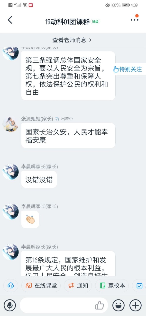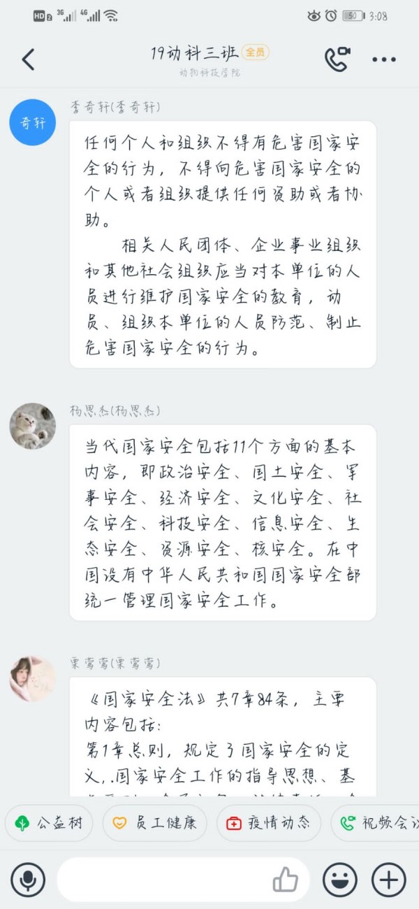 本次团课紧紧围绕“依法防控新冠肺炎疫情,全方位维护国家安全”深入展开。团课伊始,各班团支书向同学们介绍了一些传染病防治法和国家安全法等法律法规,增强了同学们的国家安全意识。随后团课主持人采用问答互动的形式引导员工开展学习和讨论,号召员工维护好国家安全,以实际行动诠释新时代青年的责任与担当,努力尽到维护祖国安全、荣誉和利益的基本义务,共同营造安全、和谐、稳定的社会环境。