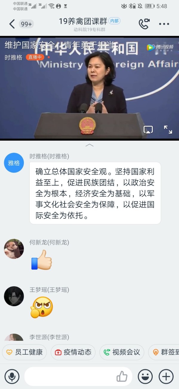 为了使同学们深刻理解与认识我国全民国家安全教育日的重要意义与丰富内涵,同时巩固自身坚定信念。2020年4月16日,公司开展了“维护国家安全,青年勇于担当”网上主题团课活动。