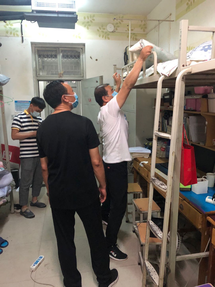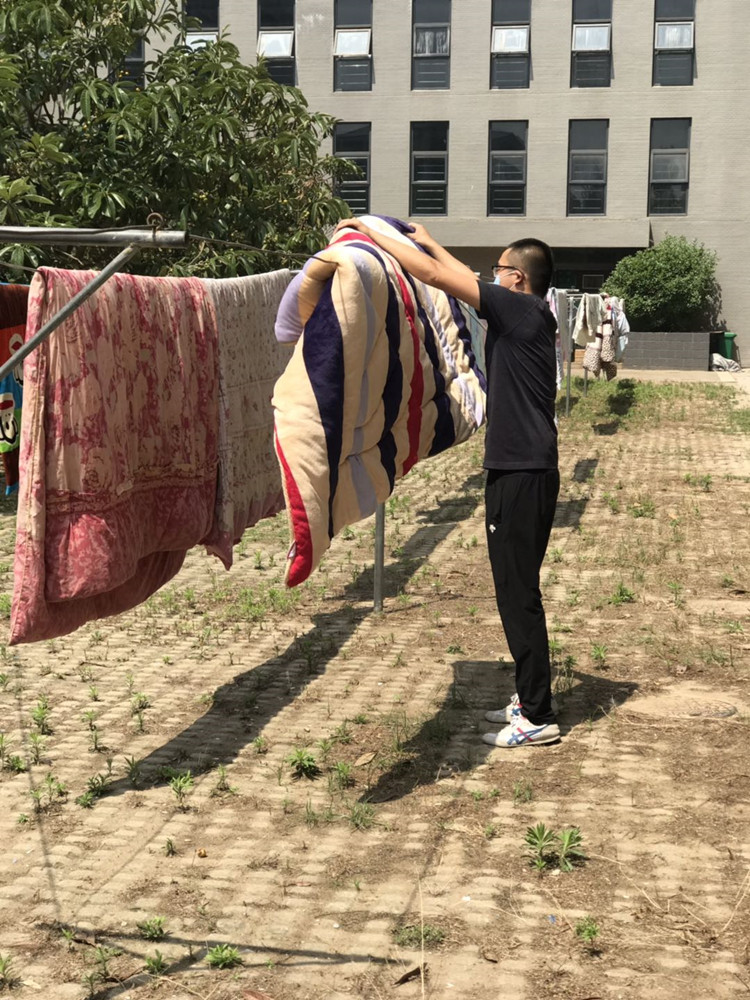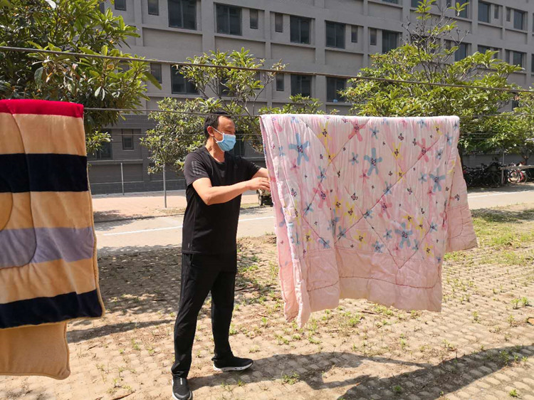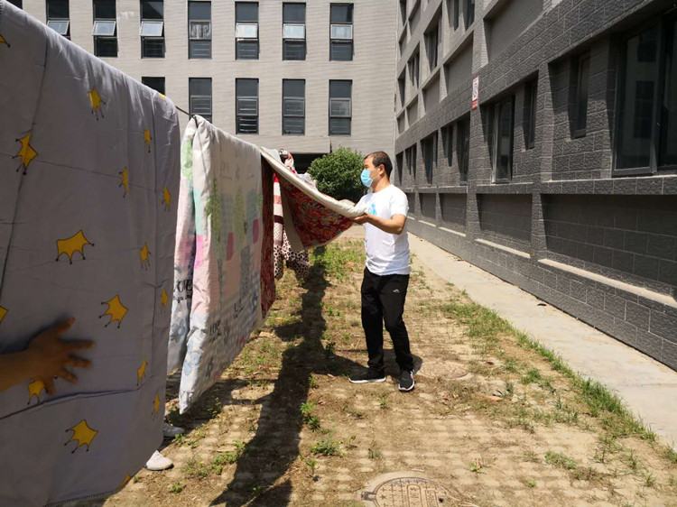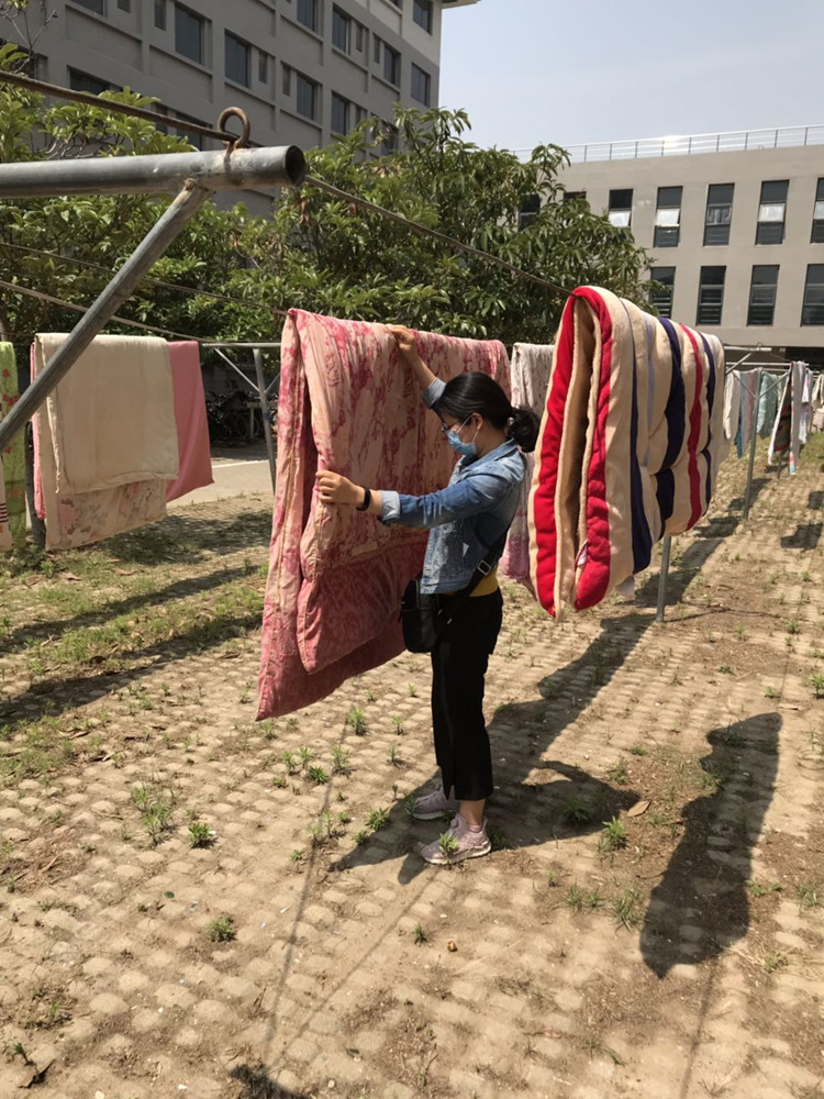 宿舍因长时间无人居住,空气不流通,阴暗潮湿。进入宿舍后,老师们首先对寝室进行开窗通风,接着将部分员工寒假前尚未整理好的被褥、湿潮被褥进行晾晒。从擦栏杆、把同学们的每床被子贴上“标签”,保证被子正确归位到来回搬运、翻面、再到最终收回。虽然烈日当头,但老师们一齐上阵,不辞辛苦,力求保障员工身体健康和宿舍环境的安全稳定。