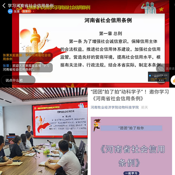 和谐社会,诚信为本。公司通过钉钉直播、微信公众号宣传、召开师生会议等多种方式对《条例》进行宣传和学习,团总支书记张粟在会议中强调《条例》的颁布实施是我市信用体系建设的里程碑,是全面落实习近平新时代中国特色社会主义思想的重要举措,对社会信用记录、采集、归集、共享、披露、查询和使用予以规范,有利于保护信用主体的合法权益,使守信联合激励和失信联合惩戒有据可依,同时对当地信用服务行业的规范发展起到促进作用,将对于深化“放管服”改革、提升社会治理能力和水平、增强全社会诚信意识、推动经济社会高质量发展起到十分重要的作用。《河南省社会信用条例》是继上海之后,全国第二部省级社会信用综合性法规,它的出台为新时代全省社会信用体系建设提供了强有力的法制保障,它的出台也会让我们中原更加出彩。