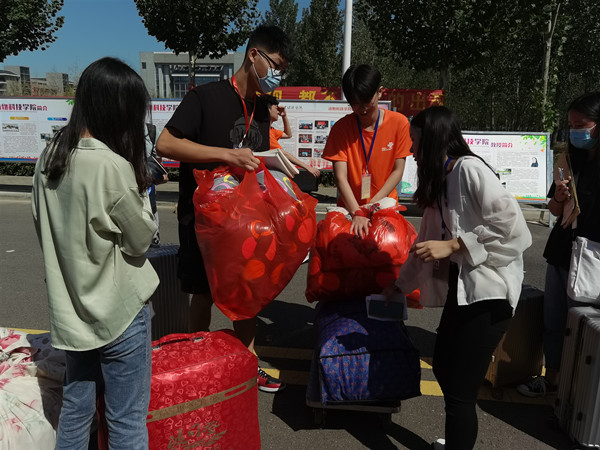9月18上午,公司迎新现场展板林立、彩旗飘扬,公司党委书记王建伟、经理席磊及班子成员,坐镇现场亲自指挥;院团委全体辅导员带领800人次的青年志愿者,紧张而有序的迎接着来自全省各地的新同学。按照学校疫情防控工作的统一安排和要求,学院认真核查新生二维码、收取“三单一书”,无误后及时为新生办理报到手续;经过严格培训的公司青年志愿者,拉着小推车、骑着“爱心三轮”,接过新生的行囊,陪伴新生进入大学四年的新家——宿舍;经过简单安顿后,员工助理带领部分新生,领取军训服装、购置脸盆衣撑,漫步校园熟悉环境,畅谈老员工活,引导尽快进入角色、扬帆起航。