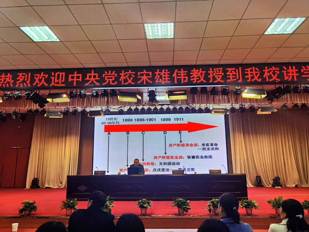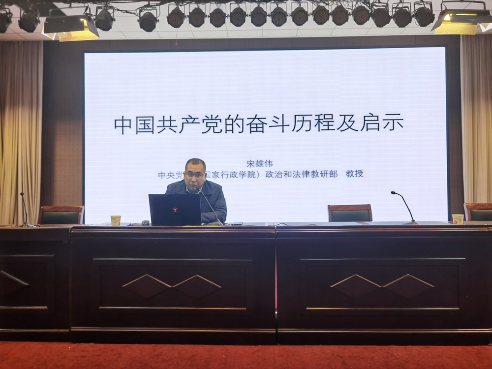 宋雄伟以《中国共产党的奋斗历程及启示》为题,以中国共产党党史为主线,从中国近代历经的新民主主义革命时期、社会主义革命和建设时期、改革开放和社会主义现代化建设新时期、以及新时代中国特色社会主义的伟大事业四个方面,用生动的语言、清晰的经纬,通过典型的历史事件、代表人物,结合中国共产党成立的历史背景、发展的曲折艰辛、壮大的波澜壮阔和成就的灿烂辉煌,系统讲解了中国共产党领导人毛泽东、邓小平、江泽民、胡锦涛和习近平在不同的时代背景和社会条件下,带领中国人民冲破艰难险阻,摆脱了帝国主义、封建主义和官僚资本主义的压迫,从站起来、富起来到强起来的光辉历程。报告中,宋雄伟从历史发展的角度统筹“中华民族伟大复兴的战略全局和世界百年未有之大变局”两个大局,分析了国内、国际形势以及我们面临的挑战和机遇,宋雄伟指出,中国的“全局”与世界的“变局”同步交织、相互作用,要善于从危机困难中捕捉和创造机遇,党的十九届五中全会的胜利召开、《中共中央关于制定国民经济和社会发展第十四个五年规划和二〇三五年远景目标的建议》审议通过,正是我们党对百年未有之大变局的辩证应对,只要我们树牢“四个意识”、坚定“四个自信”、坚决做到“两个维护”,永远听党话跟党走,中国人民实现中华民族伟大复兴的中国梦一定会实现。
