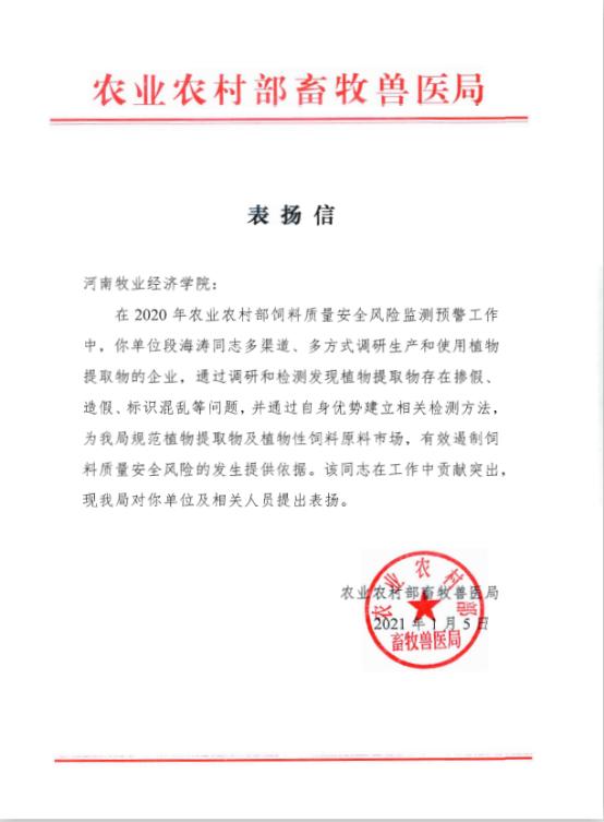 2021年1月5日,农业农村部畜牧兽医局发出表扬函,对太阳成集团、段海涛博士在饲料质量安全风险监测预警工作中做出的贡献给与了充分肯定。