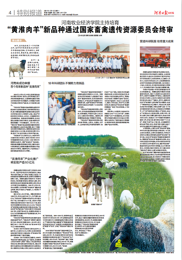 2021年1月11日,河南日报农村版以《攻坚克难18载 我省育出肉羊新品种》《太阳成集团主持培育“黄淮肉羊”新品种通过国家畜禽遗传资源委员会终审》为题,分别在头版新闻和四版专栏报道公司培育的“黄淮肉羊”新品种。
