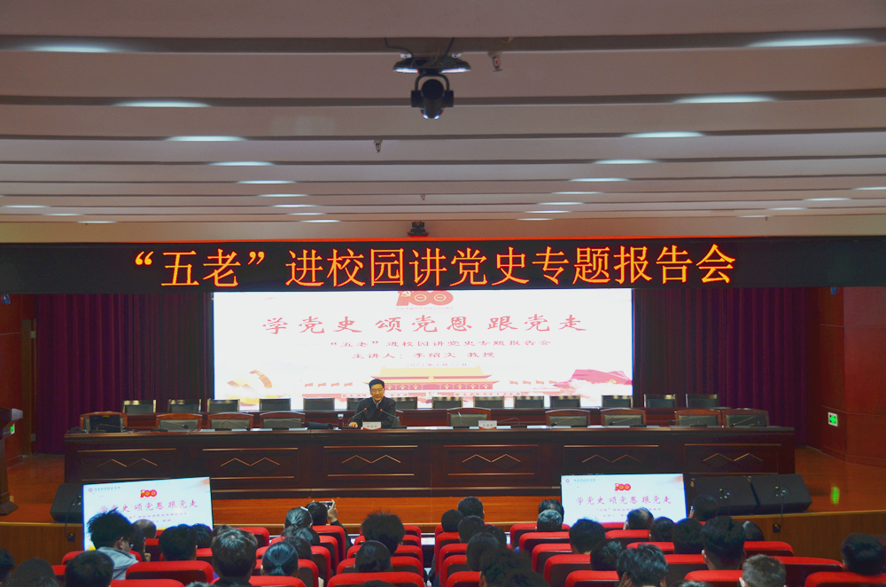 按照公司《关于开展“五老”进校园讲党史活动的通知》精神,为充分发挥学校“五老”的优势作用,推进公司党史学习教育进一步走深走实,引领广大青年员工厚植爱党、爱国、爱社会主义的情感,让红色基因、革命薪火代代相传。在离退休职工工作处的支持和帮助下,4月22日下午,公司党委邀请集团原党委副书记李绍文教授,举办了“学党史诵党恩跟党走”专题报告。报告由公司党委书记王建伟主持,学院全体教工、员工党员和积极分子代表共计280人参加了报告会。