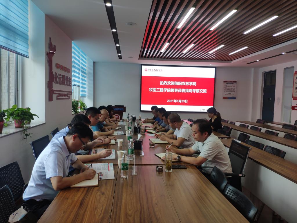 6月23日下午,信阳农林学院牧医工程公司党总支书记(经理)黄立、党总支副书记张广强、副经理邓凯伟、教学秘书秦清明、实验中心主任郑全芳、动物科学教研室主任 何书海、动物医学教研室副主任 胡静一行莅临公司考察交流,公司党委书记王建伟、经理席磊、副书记冯广鹏、副经理徐秋良、邓红雨、牛晖及学院科技干部和教研室主任参加交流会。会议在善知楼B301会议室召开,王建伟书记主持本次会议。