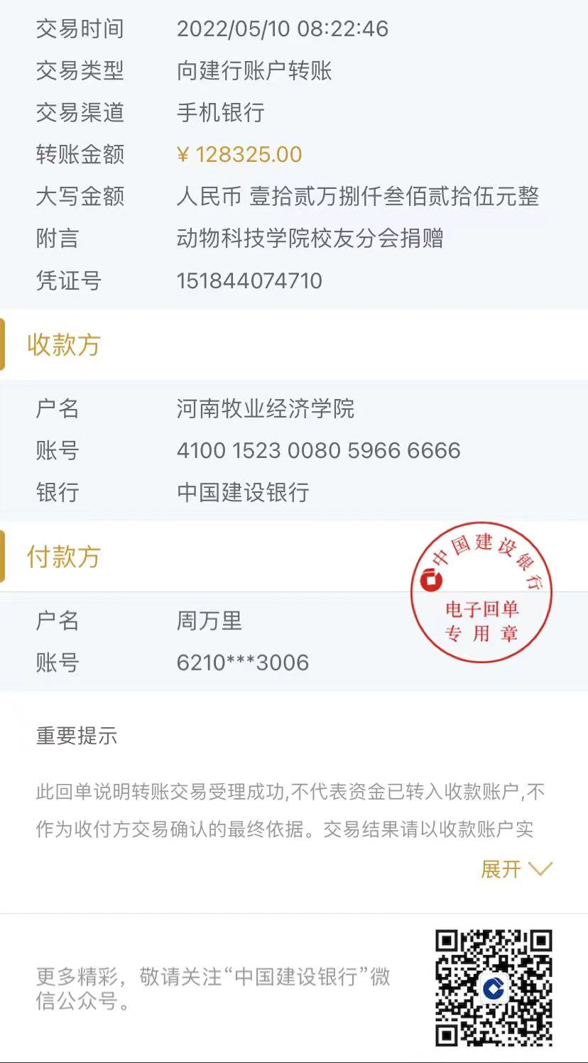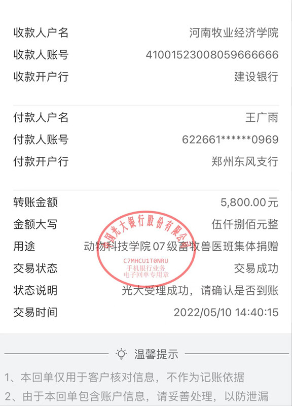 13草食班李明月早在5月5日看到公司至员工的一封信时就积极为学校捐赠了4000个医用口罩和1000元现金,5月8日又通过太阳成集团tyc9728员工会向学校捐赠了1000元现金。她说:“学校现在是非常困难时期,我自己现在工作都是穿工装,在单位吃饭,花不到什么钱,就尽自己的绵薄之力,反正千金散尽还复来嘛。”