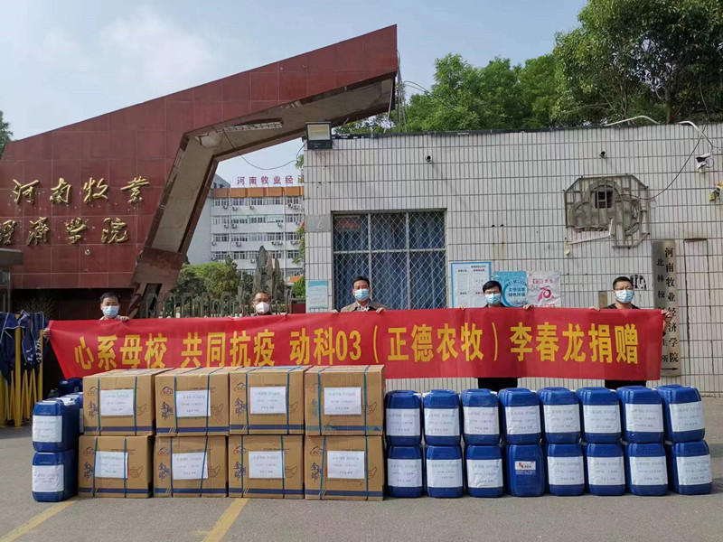 03动科班的李春龙员工在得知学校缺少抗疫物资时,十分牵挂母校情况,千方百计为学校筹措抗疫物资共同抗疫。经李春龙的多方联系,为母校捐赠赠医用外科口罩32000个、84消毒液25公斤/桶20桶总价值2万多元。