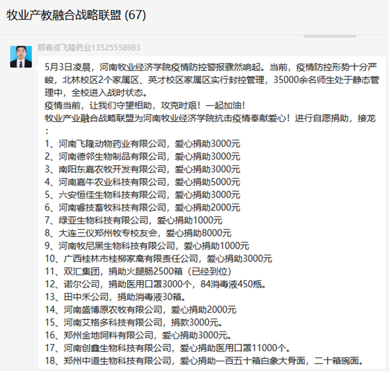培育英才校企精诚合作,疫情当前展现企业担当。5月3日公司疫情防控警报骤然响起,学校在疫情防控的攻坚阶段出现防疫物资紧张,为给公司疫情防控提供坚实物资保障,坚决打赢这场疫情防控阻击战,5月8日在牧业产教融合战略联盟单位河南飞隆动物药业有限公司董事长顾春成、南阳东嘉农牧开发有限公司办公室主任张育强、 河南德邻生物制品有限公司经理王文静等企业代表的组织下,18家联盟内企业为纷纷为学校捐赠抗疫物资。