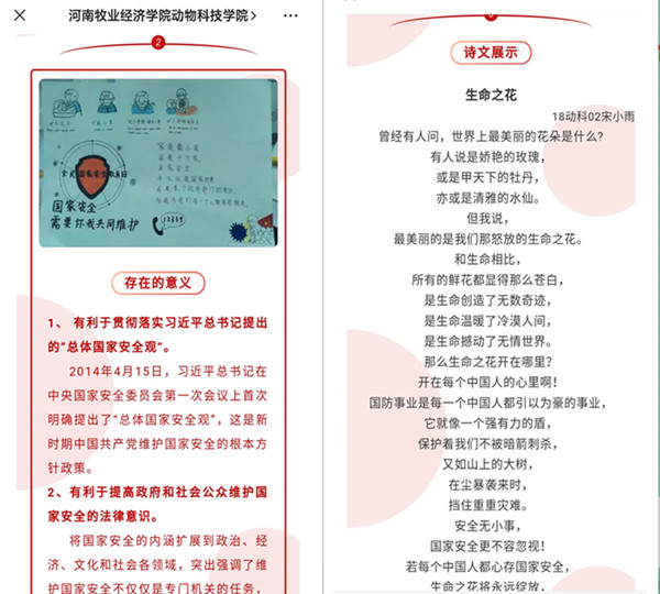 本次活动开展了以“国家安全”为主题的口号标语、微电影、微视频、诗歌散文、摄影作品等。通过广泛宣传和积极动员,同学们踊跃报名,共收集各类作品共计120余个。同学们通过参与活动,了解了国安安全法,认识到了国家安全对于每个人的重要作用,提高了同学们的国家安全意识。家是最小国,国是千万家,有了强的国,才有富的家。国家安全不能只靠国家,也要靠大家。国家安全,你我共同的责任!