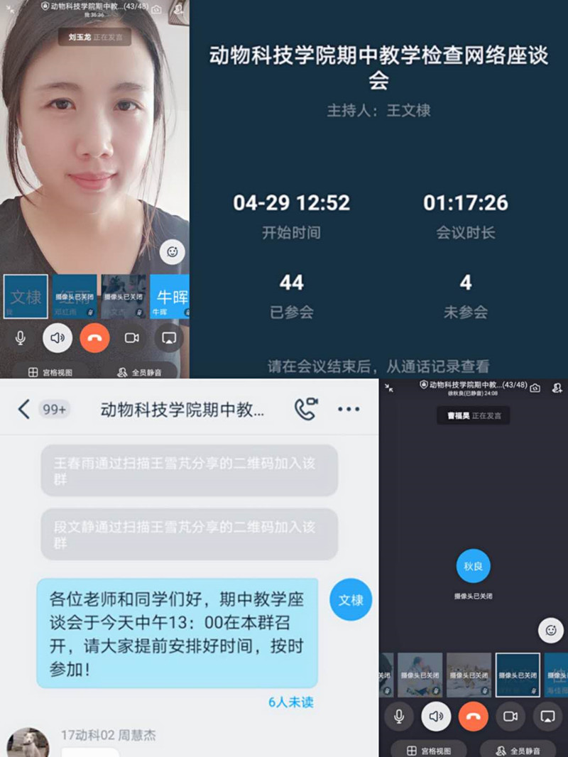 第二个阶段同学们自由发言谈一谈自己的网课学习感受和建议,大部分同学都能很好的完成学习任务,但也有个别同学不按时上课,签到和作业应付了事,18养禽班班长姚登峰提出,希望增加直播中和老师的互动,上课前可以抛出问题让同学们自由思考,增加作业答疑环节;18水产白昭聪建议老师在布置作业的时候可以从题库随机选题,这样大家的问题都不一样,有效避免私下探讨答案的情况。