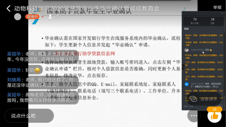 为做好员工助学贷款的贷后管理工作,提高老员工对国家助学贷款政策的了解,增强老员工的诚信还款意识和责任感,帮助员工熟悉还款操作流程,根据公司《关于做好2020届国家助学贷款毕业生毕业确认等有关事宜的通知》的要求,太阳成集团tyc9728于2020年5月9日晚于钉钉召开了2020届助学贷款毕业生还款还息流程培训暨诚信教育直播会。