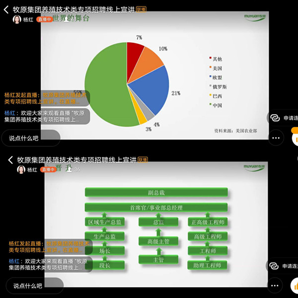 牧原食品股份有限公司一家集饲料加工、养猪生产、屠宰加工为一体的大型现代化农牧企业。公司始建于1992年,历经26年的发展,现拥有84个全资子公司和1个参股公司 ,年可出栏生猪320万头;1个合资的高档肉制品加工厂,年屠宰加工生猪100万头,年可向社会提供健康无应激纯种猪8万头,二元母猪10万头。主讲人杨红女士介绍了招聘会的应聘流程:网申报名、视频面试、发放offer、签约入职四个环节,以及2020年计划招聘的岗位人数,重点介绍了公司的发展历程、薪酬制度:包括股权奖励等。公司全部采用“一人一薪酬,一岗一方案”,尊重人才的个性化发展,秉承“谁创造谁收益、先创造险收益、多创造多收益”的原则。重新定义养猪行业,介绍了育种技术、饲料营养、无抗饲养、动物福利等相关的技术,还介绍了智能化猪舍、机器人养猪等新时代养猪智能化模式。