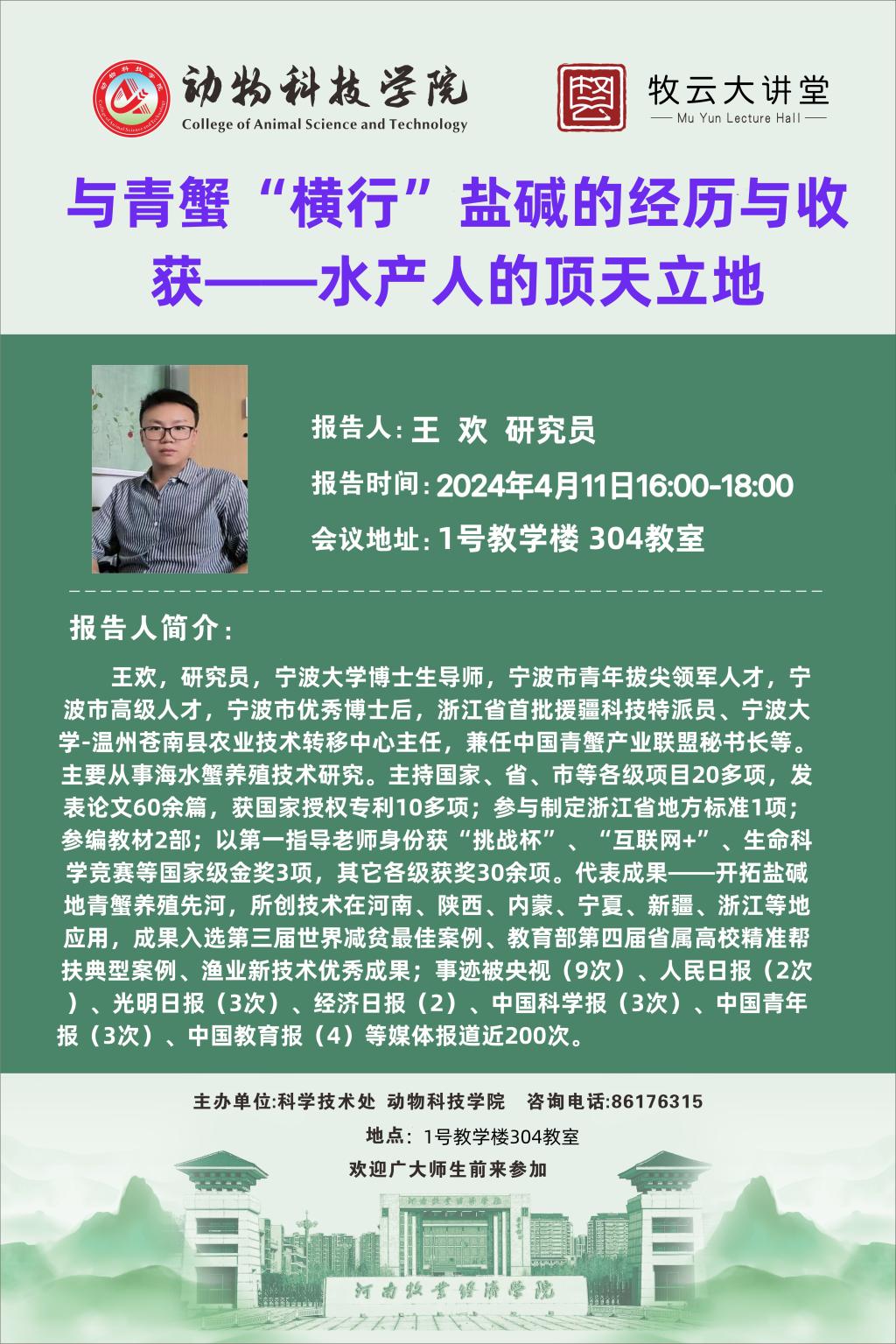 海报——“牧云大讲堂”第三十八场专题报告会《与青蟹“横行”盐碱的经历与收获--水产人的顶天立地》
