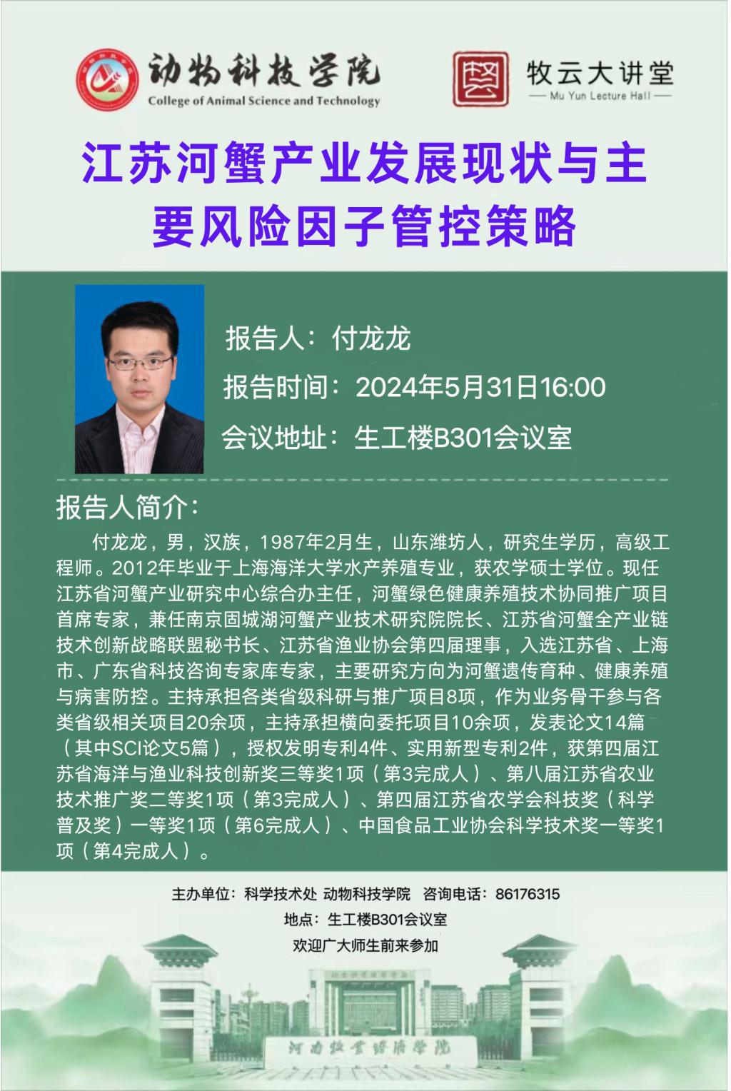 海报——“牧云大讲堂”第四十场专题报告会《江苏河蟹产业发展现状与主要风险因子管控策略》