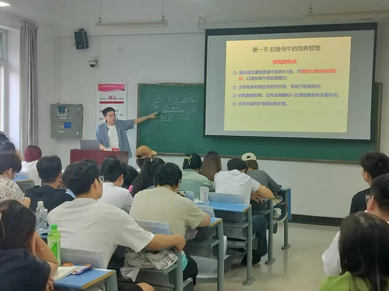 牛凯峰详细深入地讲解了犊牛、育成牛以及青年牛的饲养管理目标、主要阶段以及重点注意事项等,通过提问、互动和举例子等形式,激发同学们的学习兴趣,使其对后备母牛的饲养管理有了全面的认识。