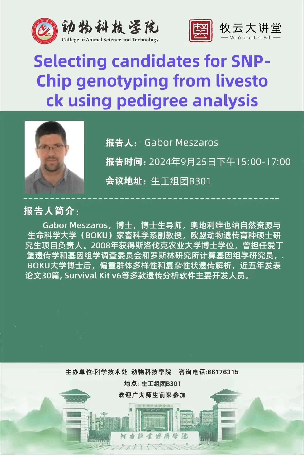 海报——“牧云大讲堂”第四十一场专场报告会《Selecting candidates for SNP-Chip genotyping from livesto ck using pedigree analysis》