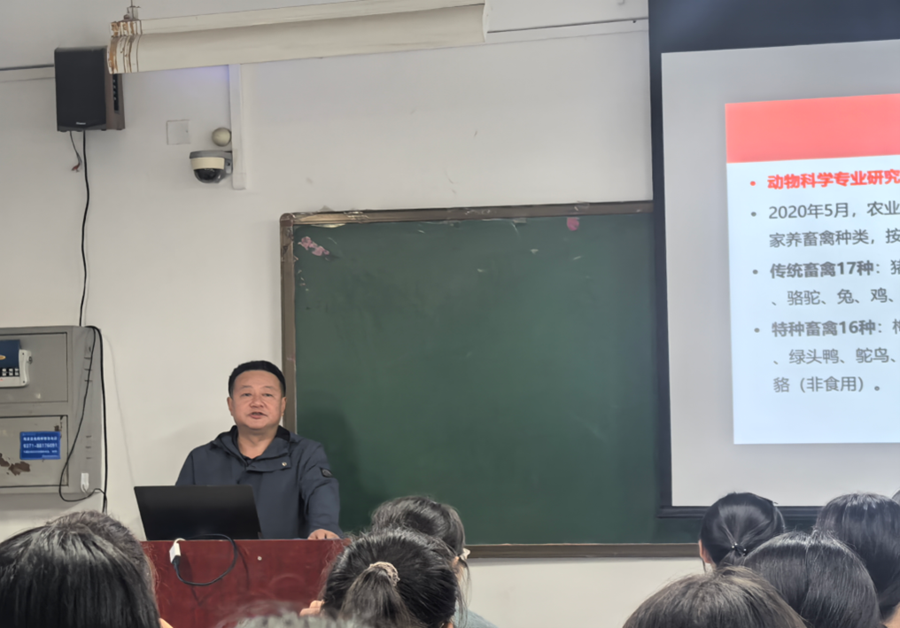 韩教授详细介绍了学校、学院的历史沿革、团队力量、教学设施、科研成果等基本情况,解读了专业的课程设置、实践教学、就业方向等。专业思想教育还邀请河南英联生物科技有限公司技术总监闫晓阳,以《我国畜牧业发展现状与个人职业规划》做了专题报告。通过对风险的自我认识原则、目标明确原则、职业匹配原则、行动计划原则和持续学习原则等知识的讲解,他让新生们对如何规划自己的职业生涯、树立正确的职业观念有了清晰的认识。